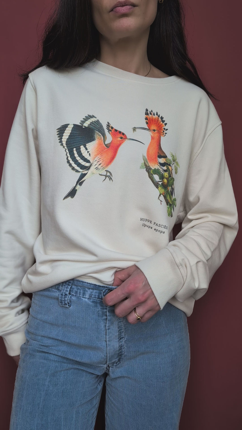 Vidéo : Pull crew neck porté en coloris blanc cassé, taille M, sur une taille femme habituelle S.